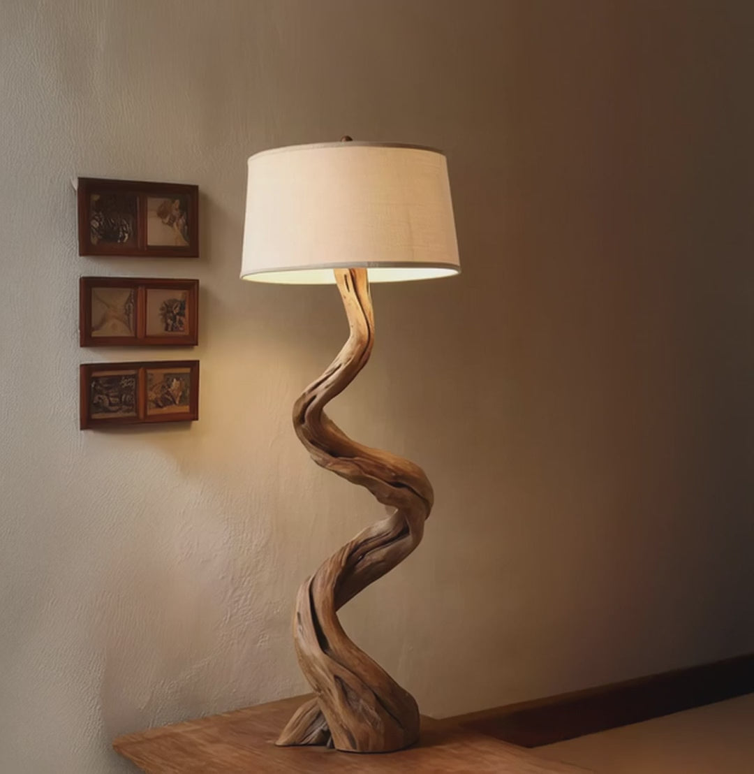 Rustic Driftwood Floor Lamp – Handmade Twisted Wood Standing Light with Linen Shade