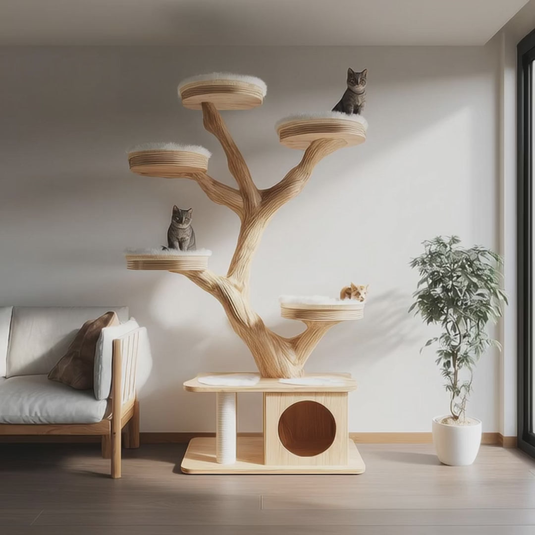 Rustic Wooden Cat Tree – Handmade Wall-Mount Climbing Tower Shelf, Unique Natural Cat Furniture
